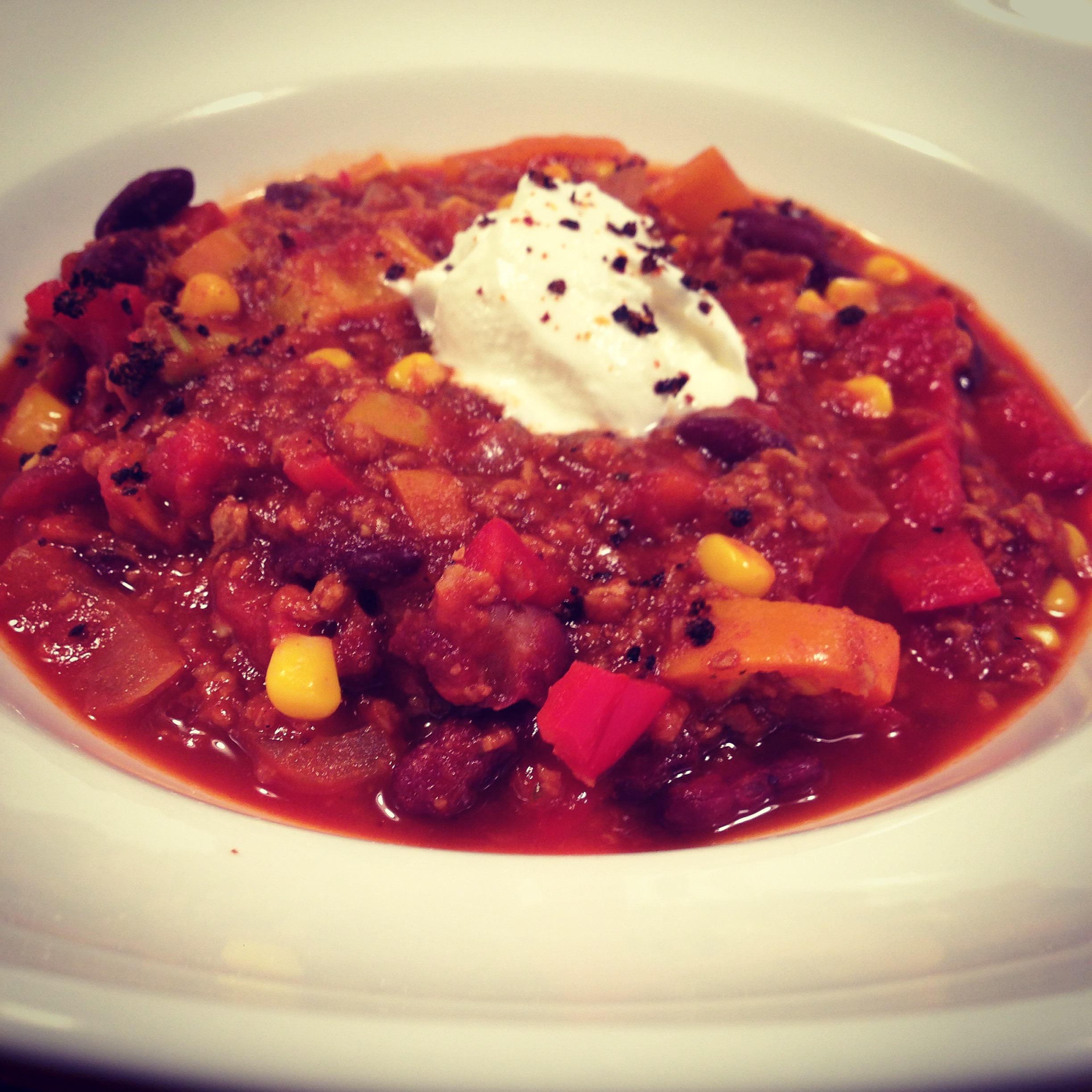 Ein veganes Chili mit Soja Schnetzel. Ich finde immer, dass man bei solchen „Matsch-Gerichten“ gar keinen Unterschied zwischen Hackfleisch und Soja Schnetzel schmeckt.